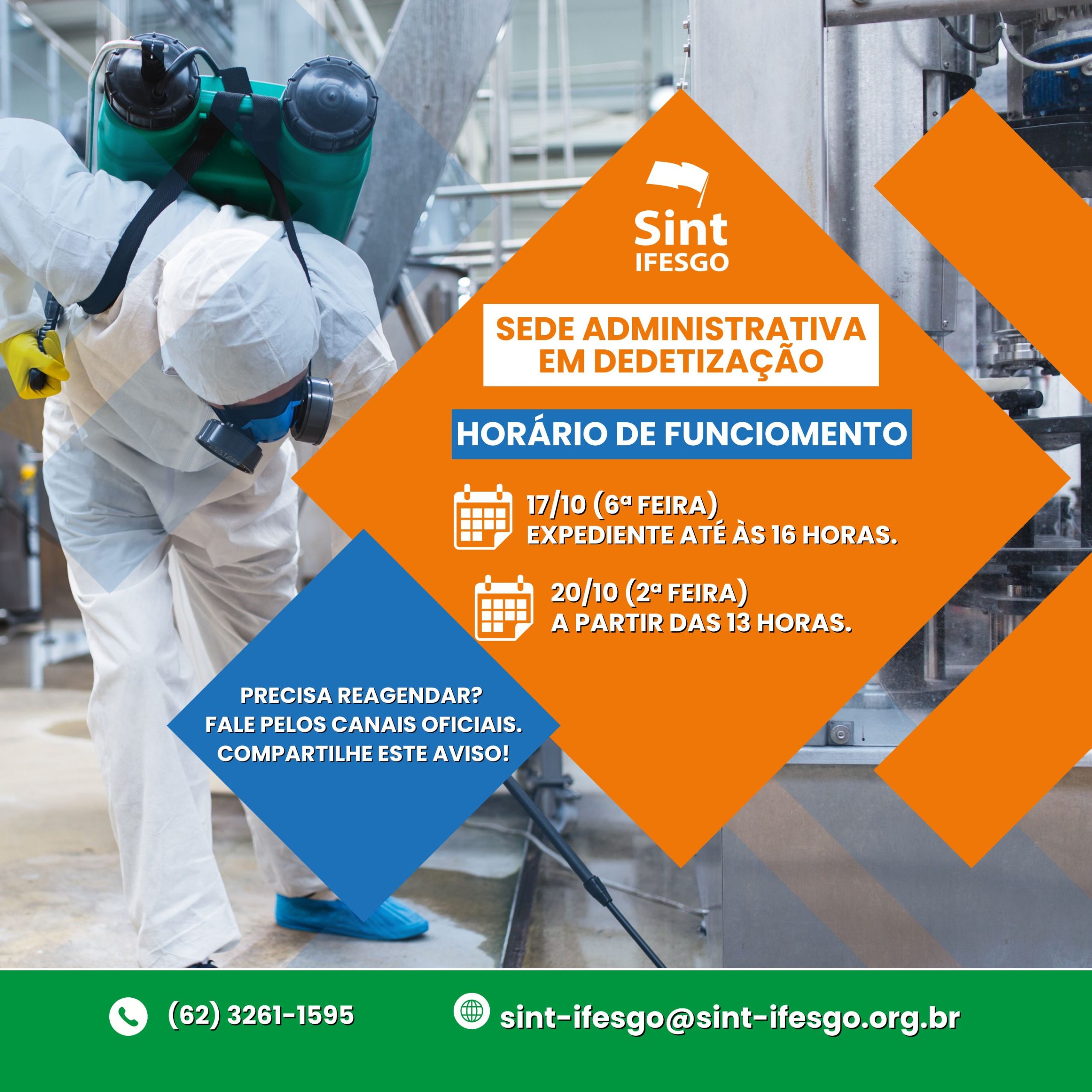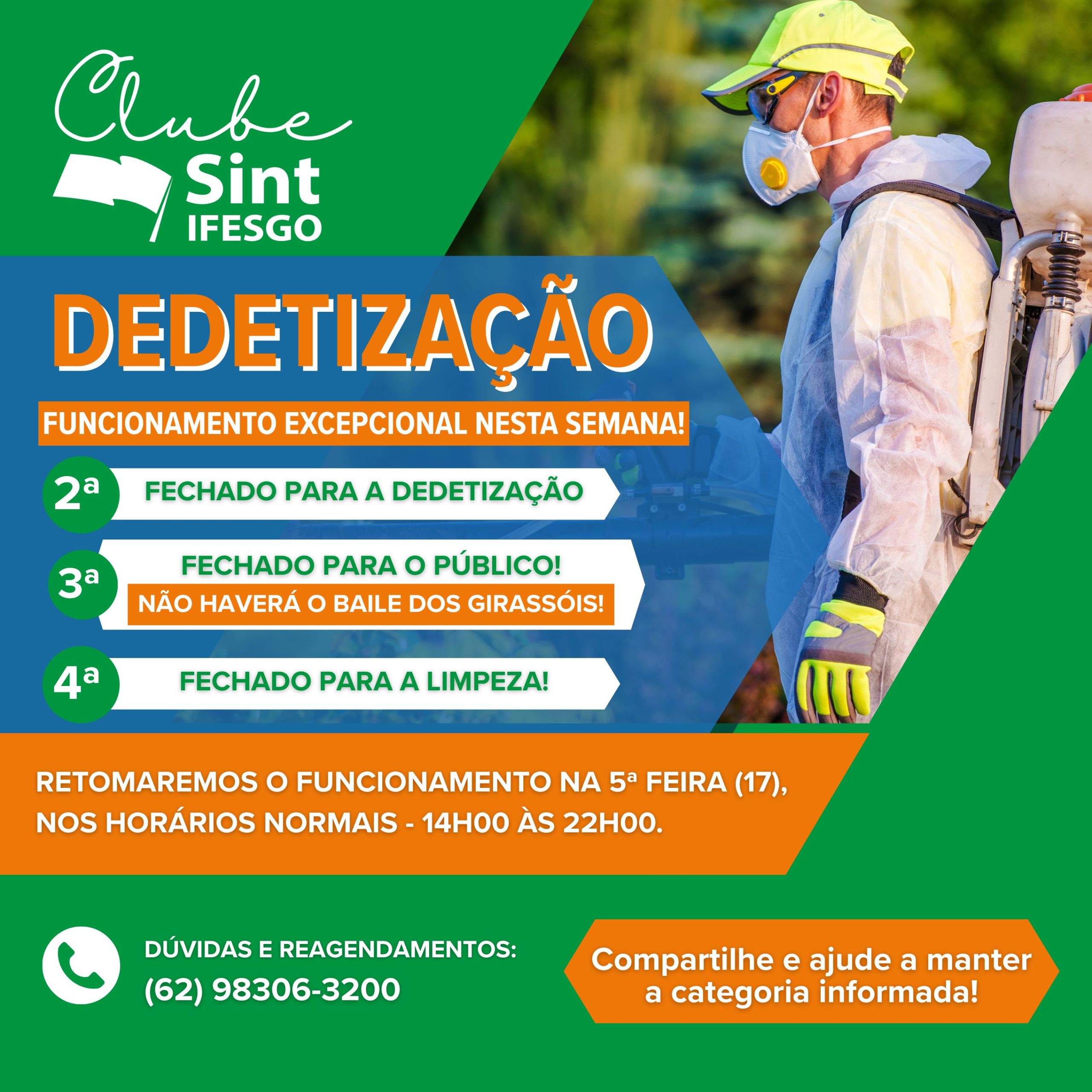 Para garantir ambientes seguros, a Sede Social | Clube Sint-IFESGO passará por procedimento de dedetização e terá ajuste temporário no cronograma de atividades