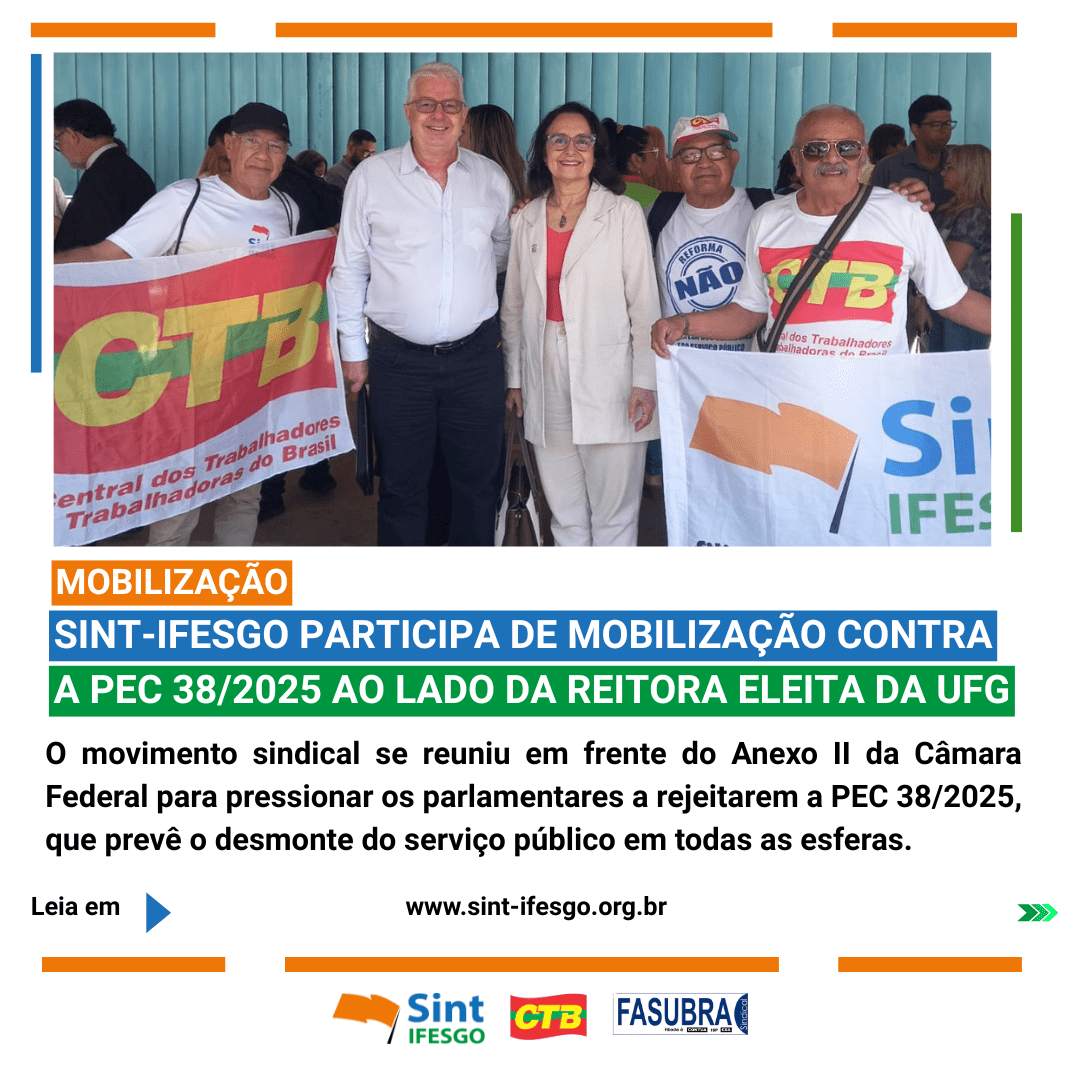 Na manhã desta quarta-feira, 05 de novembro, representantes do SINT-IFESgo estiveram com a professora Sandra Mara e com o professor Tasso Leite, na porta do Anexo II da Câmara dos Deputados, reforçando a nossa luta contra a Proposta de Emenda à Constituição nº 38/2025, a PEC da Reforma Administrativa.